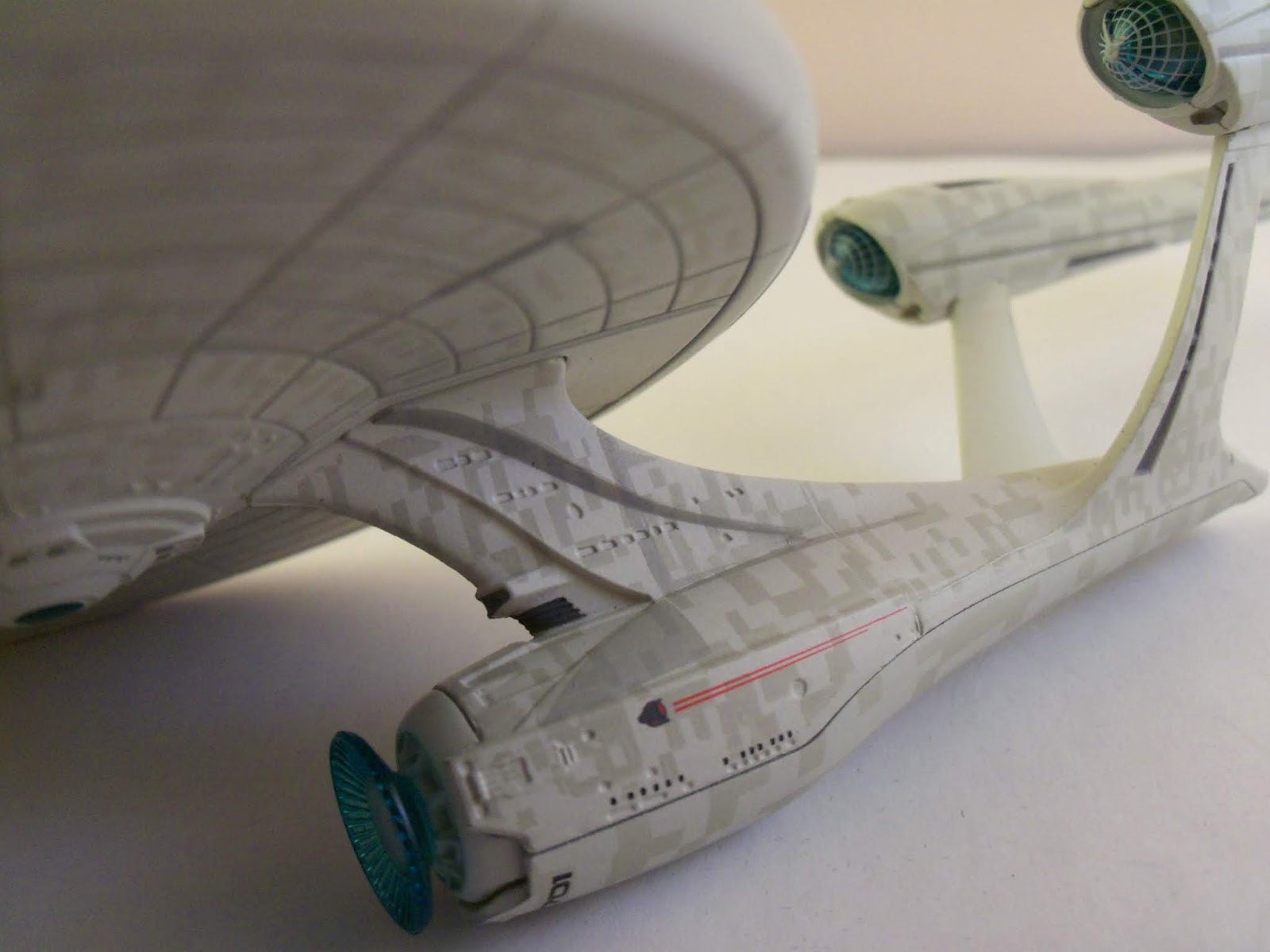 Zwar berücksichtigt das vorliegende Modell die Desingänderungen, aber vernachlässig ebenfalls etliche Details der Vorlage. So wurden zum Beispiel etliche Farbmarkierungen und Zierstreifen auch hier nicht umgesetzt. Besonders ersichtlich wird dies am Rand der Untertasse, der bis auf ein paar schlecht aufgedruckte Fenster, überhaupt keine Details hat. Auf der Ober- und Unterseite der Untertasse wurden auch die zusätzlichen Phaserkanonen nicht umgesetzt. Auf dem Brückenmodul fehlen auch die Farbzierden, wodurch dieser Bereich ebenfalls sehr karg wirkt. Die Antriebssektion ist ebenfalls sehr Detailarm, aber immerhin wurde das Sternenflottenlogo aufgedruckt. Die Deflektorscheibe besteht aus einem schönen blauen Klarteil und das wohl (einzige) schöne Detail sind die Bussardkollektoren. Den diese bestehen ebenfalls aus blauen Klarteilen, die noch zusätzlich mit einer Gitterstruktur bedruckt wurde. Immerhin gibt es auch noch einen weiteren positiven Punkt, den das Modell verfügt immerhin über ein gut aufgedrucktes Aztek-Muster.