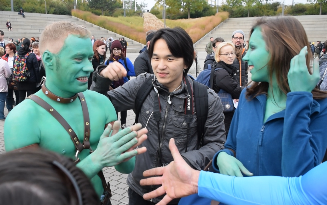 14Uhr03. Am Ende aber funktioniert alles aber dann doch so reibungslos wie zügig und wir treffen nach knapp einer Stunde Fotostress K'olbasa, Sean McElroy und Jens wieder, die in der Zwischenzeit Bekanntschaft mit der Walking-Dead-Greenscreen geschlossen haben. Wir erfahren, dass Jens' Ori-Stab nicht durch den Einlass gelangt ist, weil er die zulässigen Maximalhöhe von 1,60 Metern um zehn Zentimeter überschreitet. Hans Ötzthaler streichelt grinsend über den Wurfstern in seiner Tasche...